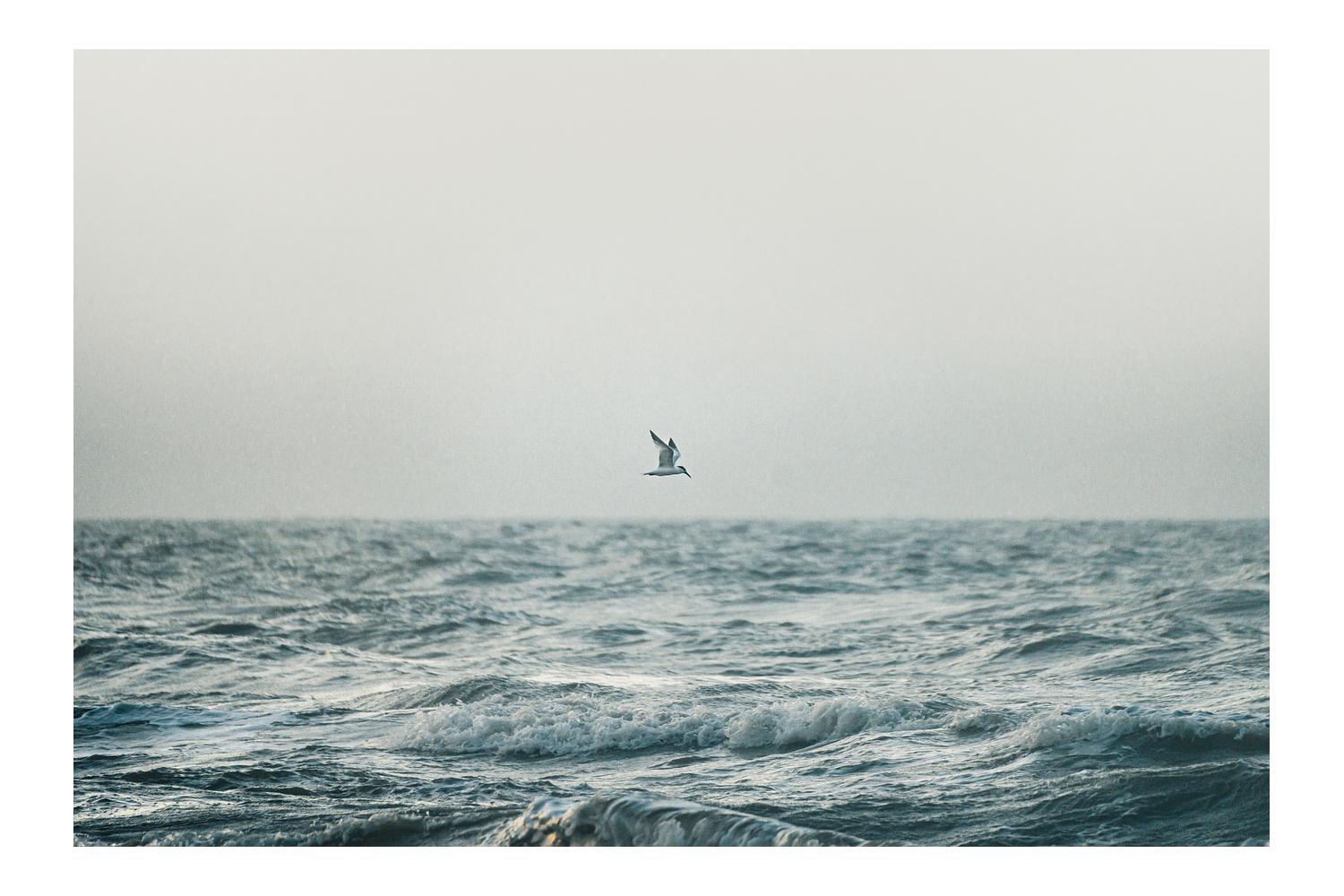 I always have the best encounters with birds in the early morning hours before the noise of the world begins. I wouldn't call myself a bird watcher by any means, but their movements and flight have always been fascinating and amusing to me. During an early morning excursion on a family trip to Galveston, TX, I got up too early for a vacation and walked over to the shoreline to sit in the sand to see the sunrise. There I sat, waiting and watching. It was still and quiet, with only the steady cadence of the ocean waves stirring around, and then, a small seagull squawk broke the silence. I watched this gull patrol the shallows back and forth, searching for its morning meal. A few times it would dive down at something with no success, but back it went, unfettered by the failed attempts, always continuing the search. A good metaphor for life, I suppose. I captured this seagull in mid-flight on one of his low passes across the shallows. A beautiful moment frozen in time and a good reminder to keep patrolling for that catch you're after.